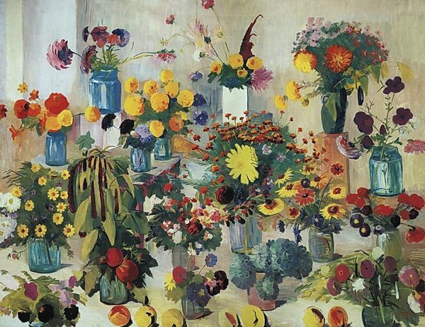 Editor: Here we have Konstantin Makovsky's "Flowers 1," painted in 1884. The riot of colors and textures is astonishing! It feels like the height of summer abundance, almost overwhelming in its variety. How do you interpret this work? Curator: This still life presents an interesting lens through which we can examine societal values prevalent at the time. Consider the explosion of botanical studies in the 19th century; plant collecting and elaborate floral arrangements became symbols of status and cultural capital. Doesn’t this abundance also remind you of the rapidly growing market economy and consumerism? Editor: That’s a connection I hadn't considered. I was just struck by the beauty of the sunflowers, poppies and squash together. Do you think Makovsky was making a specific comment on that culture of consumerism? Curator: Possibly. Note the contrast: wild and cultivated, useful and ornamental all vying for space. Makovsky's hyper-realistic technique also begs the question: Is he simply representing nature, or is he arranging and controlling it, just like society was arranging and controlling access to capital? Does he critique the societal emphasis on visual pleasure over true substance? Editor: It's fascinating how a seemingly simple floral arrangement can reveal layers of social and political meaning. I’ll never look at a bouquet the same way again. Curator: Exactly! Considering art in its historical and societal contexts enables it to speak to the modern viewer with urgency and relevance. The simple bouquet turns into a vibrant reflection on commodification and cultural aspiration!