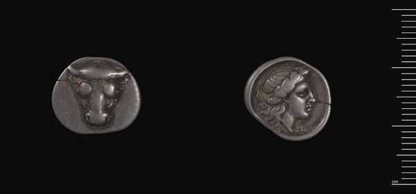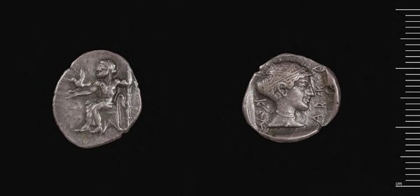 Curator: Here we have a Drachm of Mausolos, Satrap of Caria, a silver coin, now part of the Harvard Art Museums collection. Editor: It's remarkable how this small object carries such weight. The portrait has an almost haunting quality, doesn't it? Curator: Indeed. Mausolos was a shrewd ruler who recognized the power of imagery. Minting coins with his own portrait was a bold move, associating himself with divine rulers. Editor: And notice the god on the reverse? It reinforces Mausolos's authority, aligning his image with established power structures and cultural narratives. Curator: Absolutely. It’s a statement about political legitimacy and legacy, crafted for circulation among his subjects and beyond. Editor: Even in this worn state, the coin evokes the ambition and cultural aspirations of its time. It makes you think about the long echoes of power.