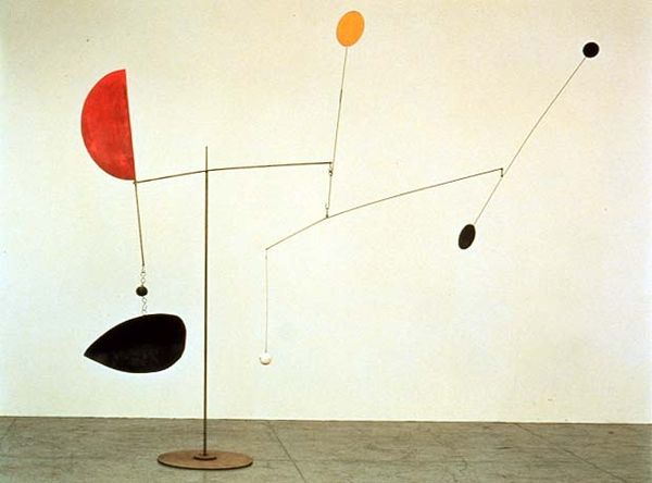 Alexander Calder crafted this untitled mobile using painted metal and wire, creating a dynamic composition of shapes and colors. The dominant black form, a curving plane, immediately captures our attention, its matte surface contrasting with the bright, glossy yellow and red elements. This interplay of textures and hues creates a visual tension, a vibrant yet balanced arrangement that seems to defy gravity. Calder’s mobile exists in a dialogue between formalism and semiotics, where the abstract shapes function as signs. The black plane, perhaps representing mass or gravity, is counteracted by the buoyant colors, suggesting a kind of visual language. The work challenges fixed notions of sculpture; it exists not as a static object but as an ever-changing constellation of forms. Consider how the simple act of suspension transforms these elements, activating the space around them and inviting us to contemplate the potential for art to destabilize established categories. With its playful yet rigorous composition, Calder’s mobile invites endless interpretation, where the convergence of shape, color, and movement generates a continuously unfolding aesthetic experience.