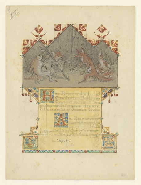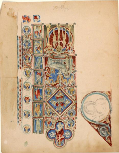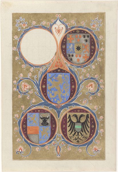 J. S. Pearse designed this watercolor coat of arms in the 19th century, presenting a study in heraldic symmetry and symbolic representation. The composition is neatly divided into two distinct registers, each framed by decorative borders. The upper section features two shields, each surmounted by a crown, flanked by allegorical figures draped in classical robes. The lower register displays an incomplete design, with a central circular space awaiting its emblem. Pearse’s use of color, primarily in muted tones, lends the piece a sense of historical gravitas. The precision in the linework and the balanced arrangement suggest a formal approach, emphasizing order and hierarchy. Pearse employs visual rhetoric to communicate power and lineage. The heraldic symbols—lions, eagles, and crowns—serve as signifiers of authority. Though unfinished, the design speaks to the cultural codes of nobility and tradition.