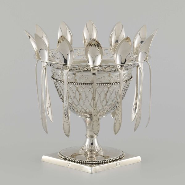 Curator: Here we have the “Presentation Candelabrum for Commodore Stephen Decatur,” created around 1817 by Andrew Ellicott Warner. It’s primarily silver, crafted in a neoclassical style, and quite imposing in scale. Editor: Imposing is right! It's simultaneously opulent and, dare I say, a bit intimidating. All that gleaming silver and those severe figural elements… it gives off a very formal, almost propagandistic vibe. Curator: Well, it was intended to be a formal presentation piece. Look at how Warner employs neoclassical motifs—garlands, winged figures—everything adheres to a specific design logic emphasizing balance and symmetry. Note the six candle arms, radiating outwards with this incredible ornate decoration. Editor: Exactly. And speaking of the winged figures, their rather… vacant expressions reinforce this sense of detached power. I'm interested in the historical context; Decatur was a celebrated naval hero, but his legacy is complicated by his involvement in the Barbary Wars, and the US's early imperial ambitions. This piece serves as an artifact of nation building through war. Curator: You raise an interesting point about Decatur's complex legacy. However, let's also consider Warner’s craftsmanship. Notice how the silverwork emphasizes volume, but at the same time achieves an airy lightness of effect. The piercing and chasing—observe the fine details of the garlands and the treatment of drapery on the figures. Editor: I see your point about the technical skill involved. But I'm wondering, what kind of statement does this object make about power, particularly in that historical moment? A society trying to distinguish itself but already wrestling with these power structures… the Barbary wars themselves raised important questions about American dominance, slavery, and tribute. How might audiences interpret such a commemorative object during and after these violent historical events? Curator: A valuable insight! Analyzing the presentation of power as an active and reactive visual dialogue is so crucial when dealing with Neoclassical pieces of presentation. Thinking beyond a value judgement or analysis of form, the audience can see this object within a larger system. Editor: Right, it’s these embedded dialogues that illuminate its cultural and historical relevance, no matter the specific era of examination.