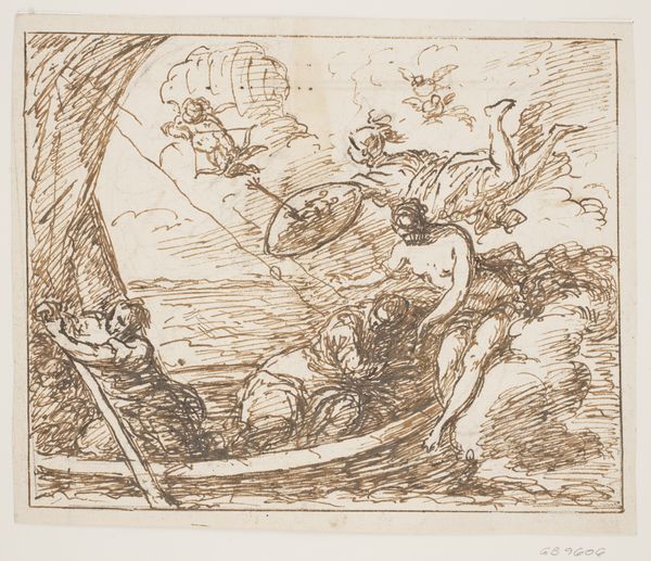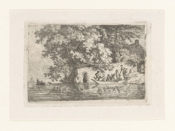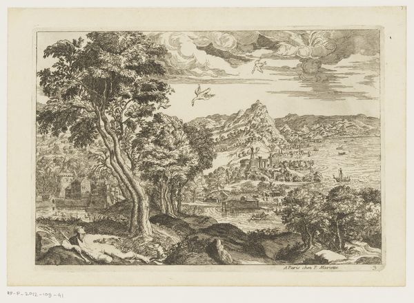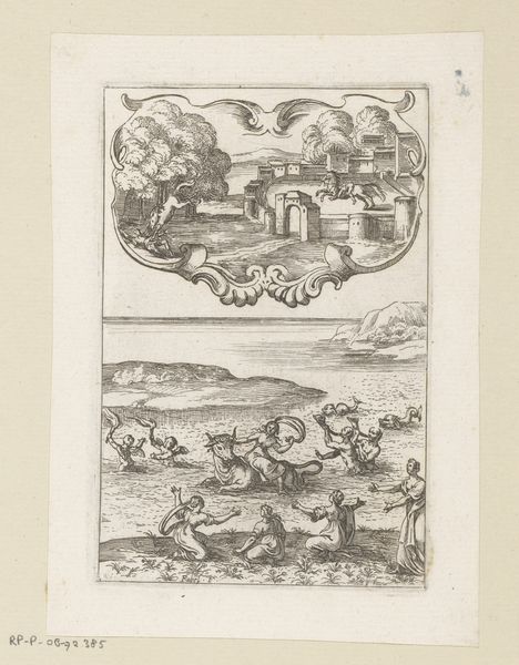 This engraving, "Augustus: zwemmen en vissen (maagd)" was created by Antonio Tempesta around the turn of the 17th century. Its composition is defined by intricate line work that renders a scene of activity along a riverbank. The artist employs a stark contrast between light and shadow, achieved through dense hatching, to model forms and create depth. The use of line becomes more than descriptive, functioning almost as a semiotic system. The undulating lines across the water's surface contrast with the more static lines defining the figures and landscape. The composition, divided horizontally, juxtaposes the earthly activities below with the ethereal representation of Augustus above, linking the earthly with the divine. Tempesta's manipulation of line and tone draws us into a world where every detail contributes to the overall narrative, highlighting the intricate connection between form and content that invites continued scrutiny.