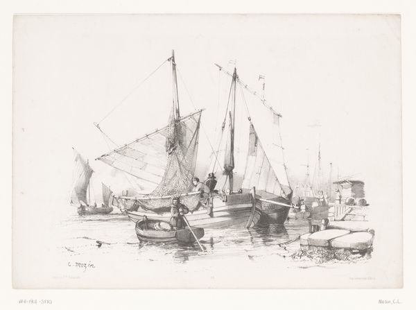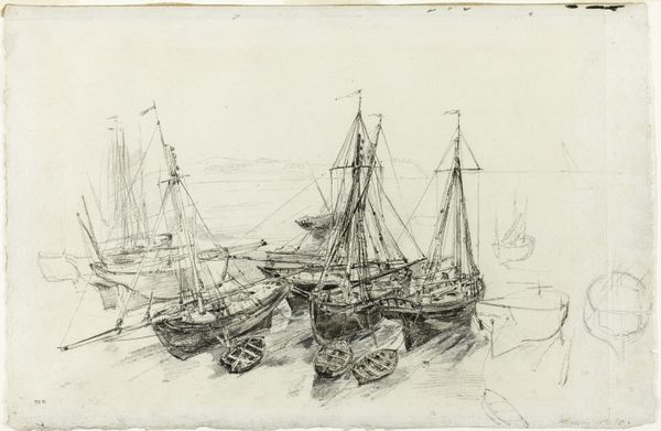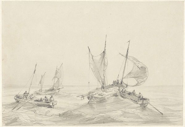 Charles Louis Mozin created this graphite drawing, "Zeilboten tussen golven" which translates to "Sailboats between waves." The composition is dominated by the dynamic interplay of angular lines defining the sails and masts, set against the fluid, curved strokes which suggest the sea. This contrast evokes an emotional response, a sense of the sublime in nature’s power. Formally, the drawing can be interpreted through a structuralist lens. The sails and masts, represented as geometric shapes, interact with the organic, undulating waves. This juxtaposition isn't just aesthetic; it's a semiotic system where geometric order confronts natural chaos. The artist creates meaning by engaging with fundamental oppositions like man versus nature, control versus chaos. The drawing thus challenges a singular, fixed meaning, becoming a site of ongoing interpretation. It uses formal qualities to engage with broader cultural and philosophical ideas about humanity's place in nature.
