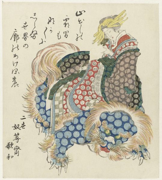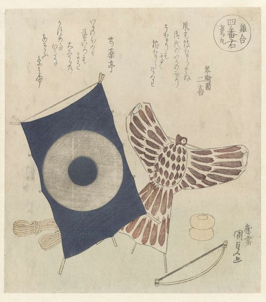 This woodblock print, "Fujiwara clan : de parels van eb en vloed en de Fujiwara zeis," was created by Katsushika Hokusai. The immediate visual impact comes from the surreal combination of geometric and organic forms. Two large spheres dominate the composition, their swirling concentric circles drawing the eye. Beneath these orbs, a draped cloth patterned with floral motifs and geometric borders cascades down, supported by what appears to be stylized legs. The artist presents a disquieting juxtaposition: the spheres, with their hypnotic patterns, challenge our perception of depth and form. The patterned cloth disrupts any sense of naturalism. The print destabilizes established categories of representation. The viewer is left to ponder the semiotic interplay between the image and the inscription, inviting us to question fixed meanings and engage with new ways of thinking about representation. It’s this dynamic interplay of form and meaning that makes Hokusai’s print so compelling.