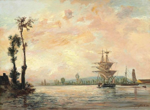 Curator: Oh, there's something almost haunting about this scene, like a memory fading at the edges. Editor: You're looking at Johan Barthold Jongkind's "Canal en Hollande," painted in 1869 using oil on canvas. What strikes me immediately is how Jongkind orchestrates a rather sophisticated visual interplay with such a muted palette. Curator: Muted indeed! But it's precisely in that subtle wash of color that the magic resides, no? The masts of those ships reaching for a sky that's barely there...it's poetic! Feels like the edge of a dream where reality begins to dissolve. Editor: Semiotically, we can examine how Jongkind uses the verticality of the masts against the horizontal flow of the canal to structure meaning. The composition guides our gaze along lines of sight, creating a sense of depth. The mirroring effect in the canal generates not only depth but symmetry across the canvas, and unity as well. Curator: True, true, the canal does reflect and unite. And that single light source...is it the sun, a star? It hardly pierces the mist, offering instead a quiet sort of luminosity that lends the whole piece a timeless feel. Did Jongkind intend for it to feel timeless, I wonder? I mean, painting en plein air, catching a fleeting moment...and yet it feels eternal. Editor: Well, placing "Canal en Hollande" within the context of his plein-air practice certainly provides a layer of interpretation. He's not just recording what he sees but interpreting light, atmosphere, the essence of a place at a specific moment. This work also aligns closely with tenets of realism. Curator: But there's emotion woven into it, an emotional truth. The artist wasn't just mimicking reality, he was imbuing it with feeling! Editor: Agreed. "Canal en Hollande" stands as an understated demonstration of Jongkind's skill, subtly beckoning deeper investigation. Curator: For me, it’s the enduring whisper of water and wood, a beautiful melancholy hanging in the Dutch air.