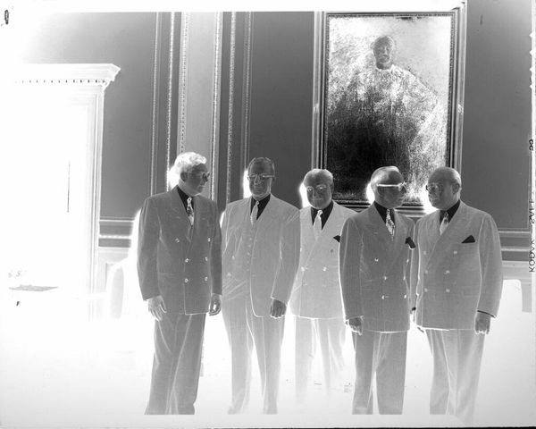 Curator: Here we have an intriguing gelatin silver print, attributed to Lucian and Mary Brown, currently held in the Harvard Art Museums. Editor: My first impression is one of dramatic tension. The inverted tones create an unsettling atmosphere, and those gestures are quite theatrical. Curator: Indeed. The photographic process itself is central here. Think of the darkroom labor, the precise chemical processes required to achieve this negative image. It speaks to a deliberate manipulation of reality. Editor: And the symbolism! The pointing fingers, a classic motif suggesting accusation or revelation, combined with the woman's wide-eyed expression... it feels like a scene ripped from a psychological drama. Perhaps representing power dynamics? Curator: Or consider the material conditions of the sitters. The men appear to be wearing suits, suggesting a certain level of economic privilege that allowed for the time and expense of portraiture. Editor: The image resonates with familiar archetypes, sparking questions about social roles and performative identities. Curator: A photograph, seemingly simple, yet so rich in material and contextual implications. Editor: A fascinating glimpse into unspoken narratives encoded within a single frame.