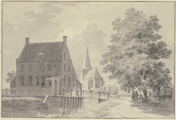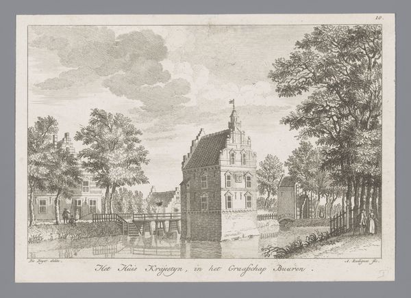 Hendrik Spilman created this print of Huis Oud-Alkemade around 1730, utilizing the intaglio process of etching. This method involves using acid to bite lines into a metal plate, which is then inked and pressed onto paper. Consider the nature of this process. It is not immediate, like a sketch, but rather involves careful planning and skilled execution. The dense network of fine lines that defines the image reveals a controlled process, mirroring the architecture it depicts. We can see the facade of a dignified country house through Spilman's careful rendering, capturing the textures of brickwork and foliage with a sense of precision. Yet, the print also speaks to a wider social context. Etchings like this were often produced in multiples, serving as a means of documenting and disseminating images of property and status. The very act of reproducing the house in print elevates its significance beyond that of a mere dwelling. Ultimately, this print invites us to consider the relationship between art, architecture, and social standing, reminding us that even seemingly simple images are imbued with complex cultural meanings.