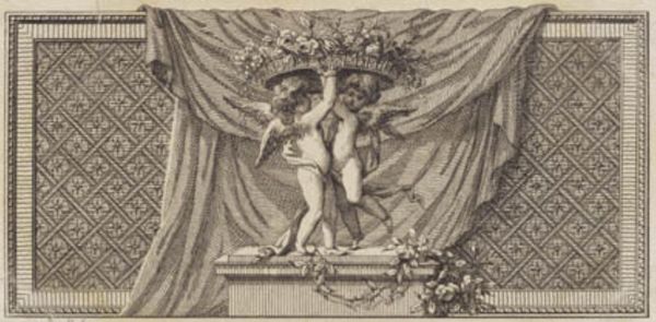 Curator: Let's consider "To smaa vingede genier," or "Two Small Winged Geniuses," an engraving created between 1776 and 1780 by J.F. Clemens, currently residing at the SMK, Statens Museum for Kunst. Editor: It’s a striking image! The texture and precision are immediately apparent, almost like looking at a highly detailed architectural rendering rather than a simple print. Curator: Note the patterned backdrop, Editor. It presents a gridded plane which subtly amplifies the foreground's sculptural elements. Editor: Exactly, I am drawn to how Clemens uses the classical cherubic figures carrying what seems like a heavy basket of blooms. The visual vocabulary harkens back to symbols of love, abundance, and maybe even the fleeting beauty of life. Curator: The line work, so consistent and deliberate, constructs volume and shadow, bringing our focus to the composition’s central symmetry. Observe how the folds in the drapery cascade, both softening and complicating the strict lines. Editor: I think there's also an aspirational quality to it; these aren't simply decorative putti. The laboring figures and the garland-draped pedestal intimate sacrifice in honor of beauty or perhaps some elevated artistic goal. They suggest duty even in paradise. Curator: Clemens manages to encapsulate an entire aesthetic ideology in a small frame; notice, even in the backdrop, no plane is left unmarked. A testament to neoclassical ideals of perfect detail in nature and artistic execution. Editor: I see that attention to detail as suggesting both permanence and fragility—the winged figures themselves are transitory beings but immortalized through artistic dedication, each precisely etched line giving them extended existence. Curator: Indeed. The piece functions as both object and allegory, revealing Clemens’ sophisticated understanding of artistic traditions. Editor: Examining its various symbolic registers lets us appreciate the piece as not merely an image, but as a distilled epoch, shaped from visual culture and enduring artistic concerns.