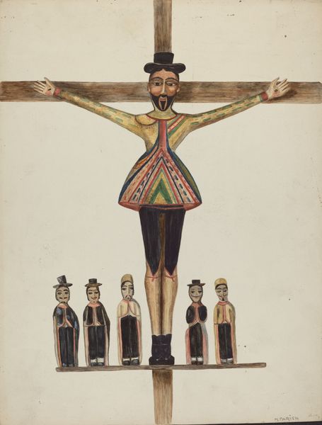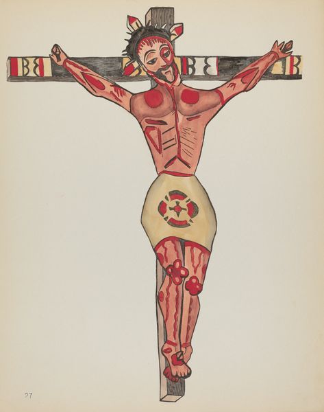 Curator: What strikes you first about this image? It’s titled "Plate 26: Christ Crucified, Taos" and it’s part of the portfolio "Spanish Colonial Designs of New Mexico," dating from between 1935 and 1942. Editor: The immediate impact is one of stylized suffering, isn’t it? The figure is gaunt and elongated; those red stripes give it a really stark visual. It's emotionally jarring. Curator: The use of those almost brutal red lines immediately pulls the eye. Notice how the anonymous artist renders Christ: elongated features, a sort of ethereal detachment. It echoes pre-Renaissance iconography. Editor: Yes, and situated in "Spanish Colonial Designs" that stylized, almost primitivist representation feels inherently political. It begs questions about power, about indigenous reinterpretations of colonial narratives. What are we meant to take away from this flattened almost graphic depiction of crucifixion? Curator: The power, I think, comes from that deliberate primitivism. It harkens back to early Christian art before it became naturalistic, drawing on older traditions. The artist uses the power of an established religious image to remind viewers of that original intensity. Think Byzantine iconography. Editor: But even in those iconographic traditions, there is typically an element of divinity. This Christ feels so deliberately human, marked, almost flayed. I find that compelling in its challenging presentation, its challenge of Eurocentric ideals and perspectives. Curator: And remember the New Mexico context! The work serves as a connection to New Mexican cultural memory, preserving devotional practice that has taken on a distinctive life separate from European traditions. This interpretation reminds people where they came from. Editor: Precisely. It also functions as resistance against dominant narratives. How does this representation of faith, altered by colonial experience, assert its identity? What about viewers then and now seeing the blood or violence; whose sensibilities does it really shock, or affirm? Curator: In confronting established symbols this artwork reveals a historical connection but also opens the way for individual reevaluation, even reclamation, doesn’t it? Editor: It’s this space, at the nexus of representation, power, and cultural inheritance, where true and ongoing change can hopefully begin.