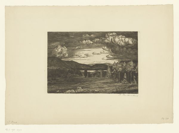 Curator: Lodewijk Schelfhout's 1914 etching, "Heuvellandschap met bomen en bebouwing"—or "Hilly landscape with trees and buildings"—presents a captivating, if somewhat brooding, scene. It’s part of the Rijksmuseum’s collection. Editor: It immediately strikes me as quite dramatic. The stark contrasts of light and shadow, especially in the sky, give it a feeling of impending weather, or maybe even a touch of the sublime. Curator: Consider the historical context: 1914, the start of World War I. It's almost impossible not to see the socio-political unrest mirrored in the landscape. Perhaps Schelfhout used this scene to subtly address themes of uncertainty and vulnerability. Editor: That's an interesting angle. The fortress-like structure on the hilltop does seem less protective and more exposed given that understanding. Its geometric forms certainly convey a sense of modernism, yet the overall composition feels timeless. I'm curious about the choice of monochrome here. Was it simply the constraint of the etching medium, or something more? Curator: Monochrome inherently directs our gaze to the interplay of tonal values, enhancing the emotional impact. The absence of color encourages viewers to interpret mood and symbolism without distraction. Think of the political symbolism embedded within the work – did this choice further conceal this message? Editor: True. And when we discuss audience, its politics, and museum's cultural sway... Schelfhout presents this seemingly serene village as something potentially fragile. Do you think this vulnerability humanizes its occupants somehow? Was this a strategy to incite discussion about human relationships during moments of social despair? Curator: It absolutely reframes the village beyond a mere architectural form. It speaks volumes about humanity's precarious position during periods of seismic social change. The formal constraint with geometric pattern and monochromatic palatte presents complex ideas about social anxieties from Schelfhout. Editor: I hadn’t considered it that way at first, but by positioning the etching as a cultural artefact shaped by historical anxieties, it is so much richer to consider through contemporary lenses. Curator: Indeed. The artwork reflects not only the environment surrounding it but, simultaneously, shapes societal narratives around collective vulnerabilities.