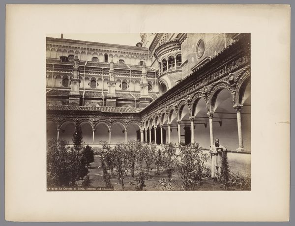 Curator: This albumen print, titled "Binnenplaats van het Grazer Landhaus, Oostenrijk," attributed to F. Völke, invites us to explore a 19th-century Austrian cityscape. The dating suggests a timeframe between 1867 and 1900, a period of significant cultural and political transformation. Editor: The overwhelming sepia tone lends a dreamy, almost surreal quality to the image. It's serene, yet something feels slightly off. The scene feels incredibly posed and artificial. Curator: That's perceptive. Early photography, especially for architectural subjects, involved considerable staging. The figures, the carriage, are carefully arranged. This presentation emphasizes civic pride and progress through its portrayal of the Landhaus—a critical administrative building in Graz. Notice how the photograph's very construction mirrors institutional aesthetics, controlling even lived space. Editor: Exactly. And who are these figures and for whom was this photographed? The seemingly romantic representation conceals that period's complex intersection of rising nationalism, and rapidly changing power dynamics between different social classes, particularly between landholders and burgeoning middle classes who were just beginning to have greater political influence. Curator: The "orientalism" tag also raises interesting questions. The Renaissance courtyard style—with its arcades and loggias—was itself, in its time, viewed as an exotic influence from Italy, becoming a familiar motif throughout Central Europe. It highlights how cultural exchange, especially through architectural motifs, has historically played a vital role in defining national identities. Editor: Though, doesn’t that “cultural exchange” usually translate to adopting without crediting other sources, mostly exoticising, misinterpreting, and appropriating motifs as well as ideas in the hand of mostly colonizers? The staged elements appear as a performance for an imagined audience. Curator: True, we can consider that through lens of unequal power structures—how these curated scenes reflect an aspirational vision shaped by dominant narratives and potentially concealing socio-economic disparities within Austrian society. Editor: In the context of that moment and viewed now, as we stand, I can see the value in understanding those tensions, as a constant reminder about social dynamics. Curator: Ultimately, examining images like this encourages us to see photographs not just as neutral documents but as constructed narratives. A window into the past that also prompts reflections about our present.