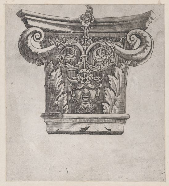 Curator: This engraving from the late 16th century by Jacques Androuet Du Cerceau presents us with, quite literally, two table designs. Both designs seem to be vying for my attention with their highly decorative and imaginative structures. Editor: I agree. There's a whimsical, almost theatrical quality to them. Look at the extravagant curves and flourishes. The linework is so precise. What kind of tables are we even talking about here? Curator: Well, given Du Cerceau's role as a designer catering to wealthy patrons, it is safe to assume that we are considering high-end furnishings. The designs reflect the aesthetics popular during the French Renaissance, characterized by ornamentation that referenced classical antiquity. These were status symbols as much as functional pieces of furniture. Editor: It’s hard to imagine anyone actually eating at these, or even putting things on top of them. The negative space is such an integral component of the composition itself. These forms seem intended to elevate or monumentalize objects placed on them, even at the expense of actual utility. It’s not about surface area, is it? It’s about visual power. Curator: Exactly! And in a time defined by powerful families seeking to consolidate their position, printed designs served an important role. Engravings like these helped disseminate architectural and design ideas to a wider audience beyond the immediate circle of wealthy patrons, informing and shaping tastes among rising elites, or really, anyone with aspirations of rising. Editor: I find it so impressive how Du Cerceau managed to balance clarity of form with the intensity of detail, even on the lower table with that incredible foliage ornamentation. It manages not to overwhelm, but to delight, and make a potential patron feel in command of culture. Curator: The tables truly serve as microcosms of their era, reflecting an intersection of artistic expression and socio-political ambition. I’m interested in where exactly these designs surfaced as implemented architectural models and how these were translated. Editor: As a piece of art, I’m inspired by the geometry, the patterns and details and how Du Cerceau used them to such aesthetic heights. They still feel surprisingly modern today.
