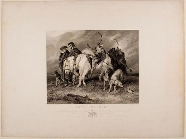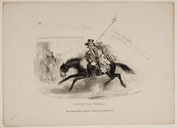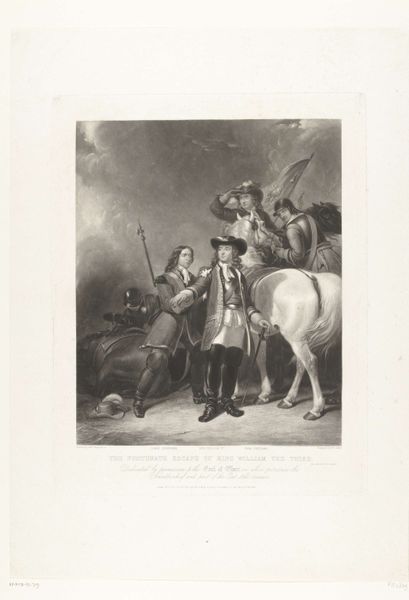 Curator: This image, held in the Harvard Art Museums, is called "Officier de chasseurs à cheval en grande tenue (ex-Garde)" by Hippolyte Bellangé. It certainly captures a moment of grandeur and military display. Editor: Absolutely. My initial impression is one of contained energy, like a coiled spring ready to unleash. The limited grayscale palette gives it a historical weight, a seriousness of purpose. Curator: Bellangé was a master of military art, portraying the Napoleonic era with great accuracy. He’s really capturing the spirit of the French cavalry here, wouldn’t you agree? Editor: Yes, but I also see a potential critique. The officer's elaborate attire, the proud steed – are these symbols of power or perhaps emblems of a system built on social inequality? Curator: Perhaps a bit of both? Artists can reflect their present, or they can try to evoke something larger than themselves, something more timeless. Editor: Precisely. And that tension—between the celebration of power and the recognition of its consequences—is what makes it compelling. Curator: It gives you something to ponder, to question, to feel a pull between eras and ideals. Editor: It does. It’s a small reminder of a time of revolutionary fervor and the rise of social stratification.