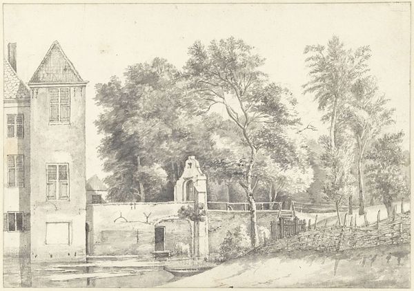 Jan Hulswit’s ‘Rijnpoort te Rhenen’ is a pencil drawing that invites us to consider the value and social context of the Dutch landscape in the late 18th and early 19th centuries. The modest scale and materials are crucial to understanding the work's meaning. Graphite pencil on paper, rendered with delicate strokes, captures the scene’s texture and light, emphasizing the everyday nature of the location. This wasn't about grand oil paintings commissioned by wealthy patrons. Hulswit chose a more immediate, accessible medium, aligning with the growing middle class and their appreciation for simpler subjects. The drawing's technique—the artist's hand tracing the contours of buildings and foliage—speaks to the directness of experience. This connects with a wider cultural interest in the local, reflecting social changes of labor, politics, and consumption. Hulswit’s choice of materials and methods elevates the ordinary, blurring the boundaries between fine art and the everyday experience.