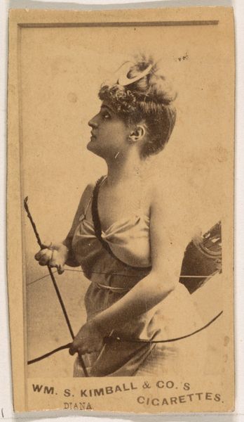 This small card, part of the "Actresses" series by Wm. S. Kimball & Co., presents a sepia-toned image of a woman costumed as Diana, the Roman goddess of the hunt. The photograph is marked by its tonal uniformity, creating a composition that is both simple and striking. The subject's pose, with an arrow held to her lips, draws attention to the interplay between vulnerability and power, a tension echoed in the contrast of the soft textures of her hair and the sharp lines of the arrow. The arrow itself bisects the image, creating a visual vector that divides the space and focuses the gaze. This use of line serves not only to direct the viewer's eye but also to suggest a narrative trajectory, hinting at the actress’s role. This construction invites us to consider how such imagery contributed to the cultural codes of femininity and representation. It suggests a semiotic system where clothing and props function as signifiers of identity. The composition here challenges fixed meanings, engaging with broader cultural values through a visual dialogue.