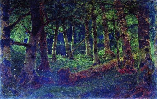 Editor: Anton Romako's "Waldlichtung mit Disteln," or "Woodland Clearing with Thistles," painted in 1885 using oil paints, is quite striking! The mood feels almost ominous, cloaked in shadow with just a peek of light. How do you interpret this work? Curator: This painting invites us to consider the romanticized vision of nature prevalent during Romako’s time and contrast it with the darker realities of industrialization and societal upheaval. What’s interesting is that he includes thistles, which, outside their aesthetic appeal, historically symbolize hardship and protection, reflecting perhaps a more ambivalent relationship with nature. Where do you think Romako situates himself in relation to nature and society? Editor: It makes me wonder about Romanticism’s obsession with the sublime—maybe he’s using these symbols of hardship to critique that ideal? The high level of detail almost emphasizes the more, prickly elements. Curator: Precisely! And let's also think about who Romako was in 1885: a somewhat marginalized figure, an outsider looking in. Could the dense undergrowth and encroaching shadows signify feelings of alienation or societal exclusion, filtered through the lens of his identity as a Jewish artist navigating anti-Semitism and a rapidly changing cultural landscape in Vienna? The “natural” world has often reflected these things, hasn’t it? Editor: That’s fascinating; I hadn’t considered the painting as a reflection of Romako’s personal experiences of marginalization. Curator: These layers of interpretation – the symbolic, the historical, and the personal – allow us to see "Waldlichtung mit Disteln" as more than just a landscape. It becomes a potent commentary on the complexities of identity and the human condition at a particular moment in history. Editor: I'll definitely look at other Romantic landscapes differently now. There's so much more than meets the eye! Curator: Indeed! Every brushstroke can tell a story if we ask the right questions.