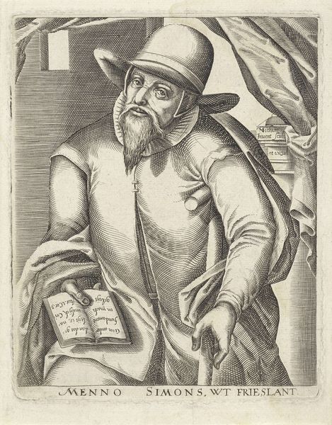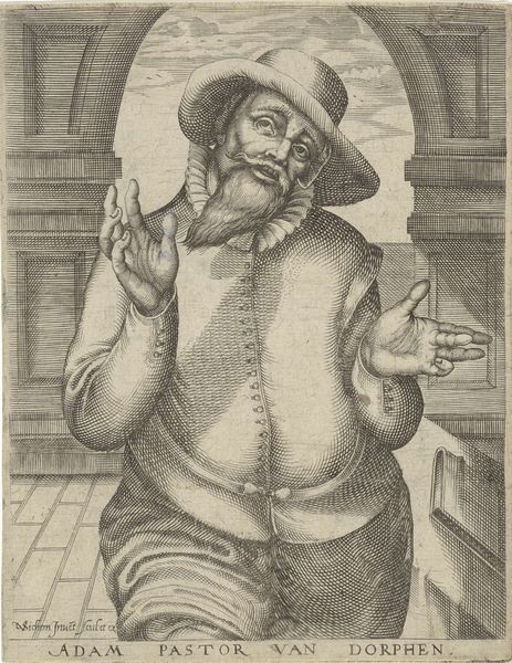 Curator: Gazing up at this intriguing portrait, I immediately sense a whimsical theatricality, don’t you? There's an almost playful lightness despite the obviously formal nature of the piece. Editor: Well, precisely that contrast is what holds my interest. This engraving, titled "Portret van Adam Pastor," crafted in 1677, likely represents Adam Pastor van Dorphen, rendered through the skilled hand of Christoffel van Sichem I. It is part of the Rijksmuseum collection, and represents a significant commentary on status through its visual style. Curator: Absolutely! The theatrical stance is wonderful, as if he’s caught mid-conversation, or maybe even in the middle of delivering a particularly engaging sermon! His gestures, with those expressively open hands, suggest so much about his character... perhaps he's caught making an appeal. Editor: That’s a perceptive read. These kinds of portraits became tools for social positioning. Here we see the subject depicted under what can be considered classic baroque principles. The social, political, and often religious turmoil gave rise to equally elaborate and often turbulent artistic production. So his pose is about far more than casual expressiveness, and his clothes depict prosperity in what was then still quite a poor part of the Netherlands. Curator: And I think you see all this drama echoed, somehow, in the details. I mean, look at those rippling lines, the light as it caresses the ruffled collar…van Sichem finds elegance in the mundane, no? The line work seems almost restless. Editor: He’s situating Adam Pastor firmly within the world of the worthy. It’s a public assertion of this figure’s social weight—engravings circulated, disseminating specific images of power, influencing and cementing societal perceptions of rank and distinction, which has repercussions and effects beyond mere artistic trends. Curator: It’s incredible how a simple portrait can be such a window onto a world, not just an individual! Van Sichem invites us to become fellow actors on his historical stage, to contemplate the rich tensions etched here in black and white, no? Editor: Exactly. What began as a personal representation of identity becomes a larger mirror reflecting power structures and cultural ideals. In our case here at the museum, a chance to reflect and maybe recalibrate such structures as we see them reproduced to this very day.