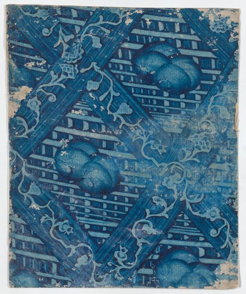 Curator: This is an example of blue paste paper with circular designs and ornamental diagonal patterns set against a crisscross background. Created by an anonymous artist, likely sometime between 1800 and 1900. The work is currently held at the Metropolitan Museum of Art. Editor: My immediate impression is how calming it feels. The monochromatic palette, dominated by blues, creates a sense of serenity and invites a closer look at the intricacies of the pattern. It’s quite hypnotic. Curator: It certainly is, and understanding the function of decorative paper during this era helps. Wallpaper and bookbinding weren’t simply aesthetic choices, but signified socioeconomic status. Consider how repeated motifs reinforced systems of power or cultural narratives, making these pieces reflections of the social landscape. Editor: From a formal perspective, the rhythmic repetition of the circles contrasted against the rigid grid and the fluid diagonal lines introduces visual complexity. It’s interesting how the artist used simple shapes and lines to create a dynamic yet balanced composition. Semiotically, one can view the grid as structure or order and the circles as a point of focus or perhaps escape, or even a break in that rigidity. Curator: Precisely. And who were these patterns made for? Were they empowering their owners or encoding subtle resistance to the restrictive design trends that had become symbolic of the elite? It opens fascinating questions about the negotiation of taste, class, and cultural identity. This paper is also deeply connected to labor practices and class, as decorative work for the home would have been available and fashionable for only some individuals at this time. Editor: I agree, and by deconstructing the patterns— analyzing the shapes, textures, and repetitions —we can start to extrapolate their meaning and understand how the artist's manipulation of form engages with our perception of space. Curator: Exploring the historical context and socio-political landscape surrounding its creation transforms how we approach this decorative piece. It pushes us to ask important questions. Editor: Yes, delving into its structure unveils both the artist's process and the latent possibilities for visual engagement and ideological deconstruction.