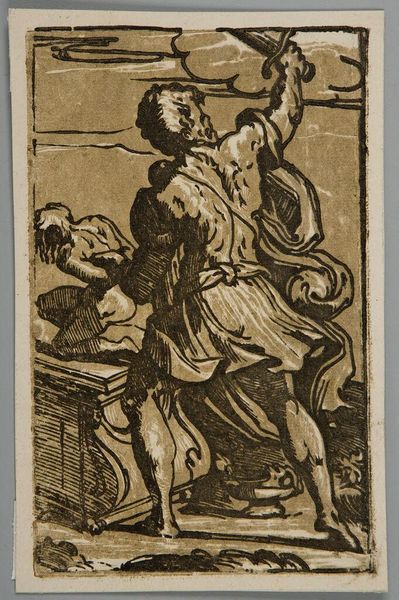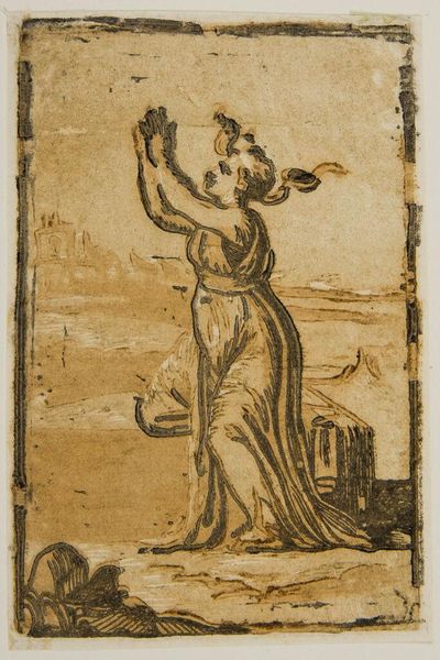 Curator: This is Giuseppe Niccolò Vicentino's "Hope," housed here at the Harvard Art Museums. Editor: It's strikingly simple, really. Just a single figure rendered in what looks like sepia tones... a kind of stark, aged beauty. Curator: Note the figure's upward gaze and raised hands, archetypal gestures of supplication and faith. It's fascinating how such basic posture conveys such profound emotional weight, drawing on centuries of visual language. Editor: Agreed. The composition, with the figure positioned against a bleak background, only amplifies that sense of yearning. The textural quality is also noteworthy, giving the piece a tactile, almost weathered feel. Curator: The background is an interesting point. The architecture, distant and somewhat obscured, may function as a symbol for the city of salvation. Hope often arises from places of ruin. Editor: True. The interplay of light and shadow creates a dynamic tension, emphasizing the figure's isolation while simultaneously imbuing her with a sense of resilience. Curator: It really is a testament to the enduring power of symbols. Editor: Yes, and a lesson in how formal elements can be so effectively used to portray raw emotion.