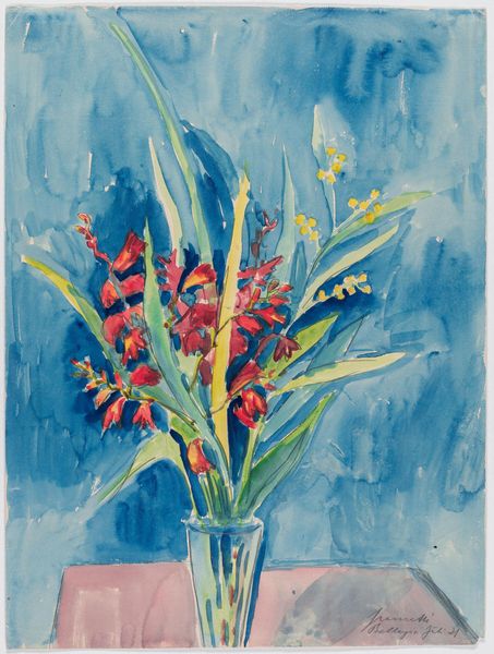 Curator: Look at this striking yet humble still life by Émilie Charmy, "Flowers in a Vase," created around 1914. It appears to be executed in watercolor or a similar medium, a style leaning towards impressionism. What’s your initial read? Editor: It feels ephemeral. The brushstrokes are so loose, almost dissolving into the pale blue background. The whole composition gives off this dreamy, almost melancholic, impression. It feels very much of its time, just before everything changed with the first World War. Curator: That melancholic mood is interesting, especially when situated in the broader context of early 20th-century Paris. Charmy exhibited at the Salon d’Automne, joining a community of female artists seeking to create work within, but also often outside, the strictures of the male-dominated art world. Still life paintings, while traditionally regarded as lesser subjects, afforded women artists more access. Editor: Absolutely. There's this push and pull that resonates deeply here. Flowers, conventionally feminine, are depicted with a restless energy that seems to disrupt those associations. The rough handling of the medium rejects delicacy. Does it reflect the social restraints placed upon women in that period, who were expected to create only gentle artworks of still life or the home? The energy is palpable. Curator: It’s difficult not to consider these dynamics, when so many art histories often center male perspectives, obscuring contributions like Charmy's. Here the vase itself, usually a stable element, tilts slightly as though struggling to contain its floral burst. Editor: Exactly. What appears to be a commonplace subject becomes fraught with symbolic weight. The very act of displaying flowers – of cutting and confining them – might symbolize contemporary patriarchal structures. And those strokes of red mixed into the sky hint at a rising unease, the growing war and social upheaval perhaps? Curator: Perhaps. It offers such a powerful example of how even a simple still life can be charged with a complexity of emotion and ideas, especially when we situate it in its historical context and view it through a critical lens. Editor: Yes, that's a crucial insight. I see Charmy’s "Flowers in a Vase" no longer as a simple still life but as a profound reflection on gender, society, and impending change, conveyed with expressive grace and turbulent uncertainty.