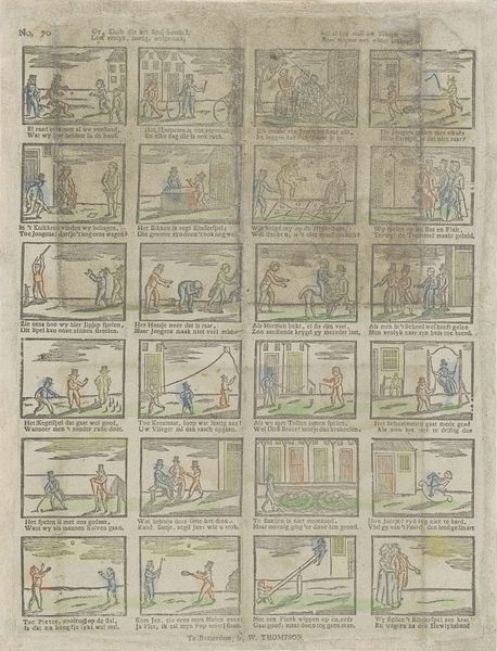 This undated print by Jan de Lange presents a series of small, framed scenes, evoking a comic-strip-like effect, though more akin to early forms of sequential art. Each frame meticulously captures various figures engaged in winter activities, from ice skating to pulling sleds. The composition relies on a grid-like structure. The color is restrained, primarily using muted blues, reds, and browns that lend the artwork an antique feel. Notice the figures; they are rendered with simple, almost cartoonish lines, yet their arrangement within each frame conveys a sense of depth and movement. The scenes use gestures to convey an idea or narrative arc. This structured layout not only organizes the visual elements but also guides our reading of the artwork. The semiotic structure prompts a deeper engagement with how meaning is constructed through sequence and juxtaposition.
