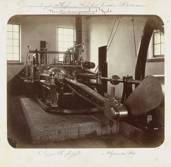 Editor: This is "Prins Alexander upper pumping station, Kralingscheveer," a photograph, possibly a daguerreotype, by Jacobus van Gorkom Jr., dated to around 1869. There's something stark and imposing about it, all these dark metallic forms in a bright space. What do you see in this piece? Curator: I see a portrait of progress, but one deeply intertwined with power. This pumping station represents technological advancement, a human attempt to control nature. But whose labor built this station? Whose land was drained and reshaped? These "achievements" often came at a steep cost for marginalized communities. Editor: So, it's not just about engineering; it's about the social implications of that engineering? Curator: Precisely. Look at the imposing scale of the machinery, rendered in the exacting detail of early photography. This wasn't just about flood control. It was about consolidating economic power and exerting dominance over the landscape, and the people who depended on that landscape for survival. How does that contrast with our present climate struggles? Editor: That makes me think about how technology isn't neutral, how it can be used to reinforce existing power structures. I had focused only on what the pumping station achieved; I did not realize the social questions raised by this photograph. Curator: Exactly. And by exploring these questions, we can engage critically with the historical narratives we've inherited, and better assess contemporary technologies. Editor: That’s really insightful. I appreciate that perspective, especially now. Curator: My pleasure. Thank you for prompting this dialogue!