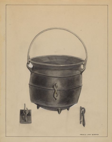 Editor: Here we have Richard Taylor’s "Egg Boiler" from around 1939, a pencil and graphic art drawing. There's something quite meticulous about this depiction; it focuses intensely on one singular object. What stands out to you in this drawing? Curator: The most compelling aspect of this drawing resides in its careful articulation of form and texture. Consider the burnished, almost metallic rendering of the main container, juxtaposed against the smooth, matte surfaces of the interior lid panels. Taylor's use of pencil creates a dynamic interplay of light and shadow that emphasizes the object's dimensionality and solidity. Do you see how the composition is strictly symmetrical? Editor: Yes, that symmetry lends it a formal, almost reverential air, despite being a common kitchen appliance. Are you suggesting that this symmetry might be the key element to explore further? Curator: Precisely. Think of the lines of sight, leading into the very center. Taylor is reducing this device to lines, shapes and angles; to pure geometric essence. The object is of minimal consequence when put this way. The true "subject" is his ability to distill the real. Editor: So it’s less about the egg boiler itself and more about Taylor’s technique? The skill in creating such a realistic representation through line and tone? Curator: Precisely. Note how Taylor almost entirely abandoned colour to capture form. This drawing prioritizes the act of seeing and rendering over all else. Editor: I never considered realism in such an abstract way. This focus on the purely formal gives the work a new angle. Curator: Indeed. Approaching art through its intrinsic visual qualities reveals a rich and complex artistic expression, as evidenced in the sharp contrasts, geometrical structure and sheer form within this drawing.