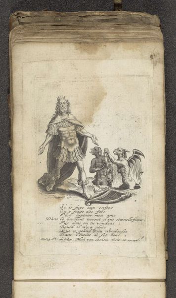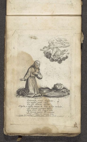 Editor: This drawing, "David met gekruiste armen in het aanschijn van God" by Michel van Lochom, created sometime between 1625 and 1647, depicts David kneeling before God. It is done with ink on paper, almost like an illustration from a book. The stark contrast of light and shadow gives it a weighty feel, yet the lines are so delicate. What catches your eye, when you view this piece? Curator: The visual interplay between line and void is quite striking. The artist masterfully employs hatching and cross-hatching to create a sense of volume and texture, particularly in the rendering of David’s robe and the divine cloud. Notice how the composition leads the eye from the lower left, upward toward the apparition of God, achieved through controlled tonal gradation and calculated placement. What do you make of David’s placement relative to his discarded crown? Editor: It is positioned right next to the crown and cape; a physical symbol of temporal power. He is letting go of worldly status to focus on the divine. What's intriguing is the almost ethereal representation of God, contrasting with the very grounded portrayal of David. Curator: Precisely. The distinction serves to highlight the dichotomy between the earthly and the celestial realms. I find it also quite compelling how the artist suggests God’s presence merely through line work. What do you make of that approach? Editor: The minimal lines invite a bit of imagination in creating God's presence. I like how Lochom chose this visual approach, instead of depicting a very elaborate divine presence. It's a subtle and nuanced. Curator: Indeed. The engraving's success lies not only in its meticulous execution, but also its conceptual depth, effectively illustrating the spiritual moment via contrasting artistic choices. A strong connection between the artwork's meaning and medium.