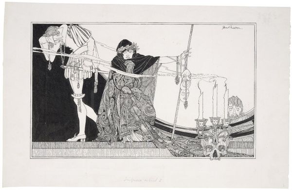 John Austen made this drawing, Hamlet, with ink on paper. The composition is striking: a stark black background is punctuated by the moon and candles, while the figures are draped in intricately patterned robes and textiles. This dramatic use of black and white creates a sense of depth and mystery. Austen's highly stylized approach reflects the influence of the Art Deco movement, where clean lines and geometric patterns were favoured. The linear quality and contrasting textures create an interesting visual rhythm. The body of Ophelia is rendered almost weightless, in contrast to the heavy ornamentation surrounding her. The drawing creates a tension between the flatness of the decorative patterns and the illusion of three-dimensionality. This push and pull invites us to consider how Austen uses form to destabilize our expectations of representation, leaving us to consider the layers of meaning embedded in this complex image.