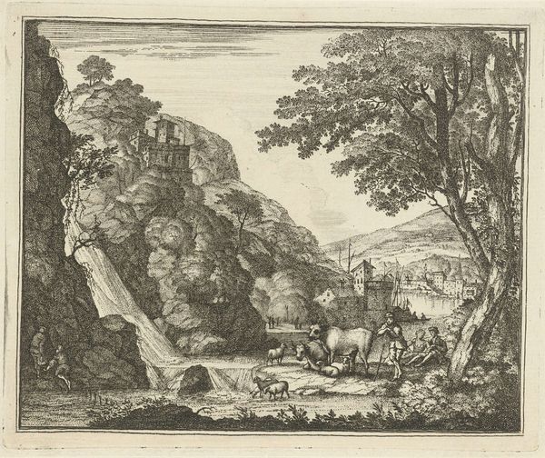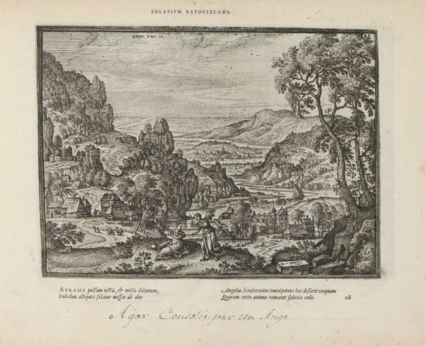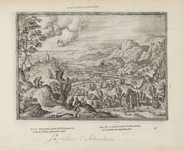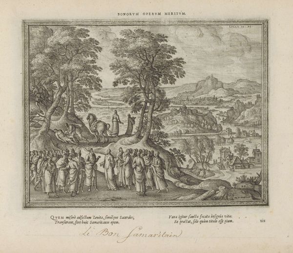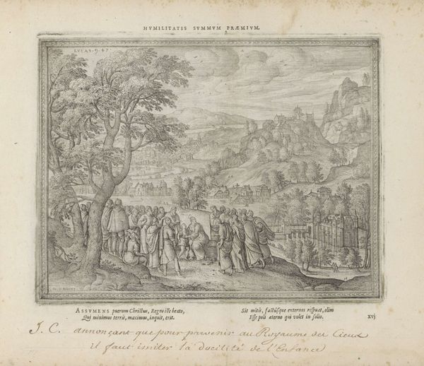 Curator: This engraving, likely dating from between 1582 and 1613, is entitled “Healing of a Leper” and it comes to us from the hand of Pieter van der Borcht the First. It’s held here at the Rijksmuseum. Editor: The linear precision achieved in the printmaking is striking. See how it models light and space with just the crosshatch and contour? The entire landscape recedes with an almost crystalline clarity. Curator: The subject itself, drawn from the Gospel of Matthew, is rendered here within a bucolic landscape setting—a common technique in Northern Renaissance art. I think the engraver successfully synthesizes sacred subject matter with accessible landscape. Editor: Yes, the symbolic landscape seems less to serve a historical record and more to create a generalized space for miraculous transformation. A rugged and picturesque landscape serves as backdrop. What’s key is the visual and iconographic positioning of the figures; the supplicant at Christ’s feet, humbled and open to receiving grace. Curator: The grouping of onlookers on the left acts as a kind of visual anchor, a way to provide spatial balance to the dramatic, devotional encounter happening in the center-right of the frame. Notice, also, the architecture; it acts as an interesting counterpoint to the natural forms. Editor: Precisely. Architecture becomes emblematic of settlement and of community, with the divine intervention set apart in contrast to this world. Leprosy, after all, was associated not just with physical affliction, but moral impurity and societal banishment. That figure being healed kneeling…a profound iconographic study in purification and acceptance. Curator: The very act of engraving enforces a discipline of line and form. One wonders if this process has parallels with the themes presented here of regulation, order, health, and hope… Editor: An illuminating observation; it brings fresh dimension to consider. Thank you.