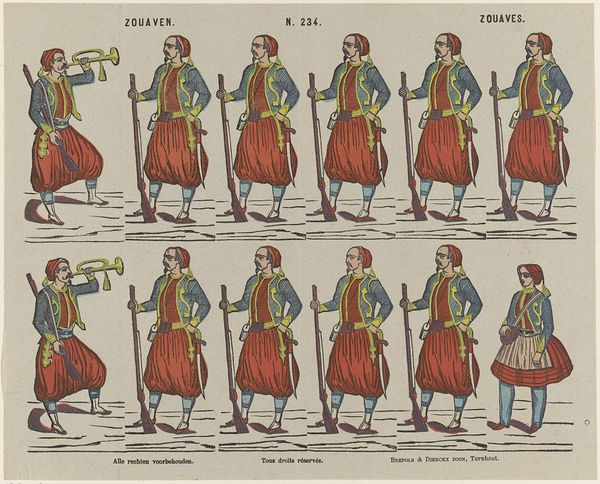 This cast of characters from Jack and the Giant Killer was printed by Benjamin Pollock, most likely in the late 19th century, using a simple method: lithography, with hand-applied color. It’s a classic example of a toy theater, a popular form of home entertainment at the time. These sheets would have been sold inexpensively, then carefully cut out and mounted by their owners – a form of early DIY. The flat, graphic style is perfectly suited to mass production, but there is also something charmingly personal in the way that each sheet was individually colored. Consider the social context: this was a time of burgeoning consumer culture, and objects like this brought the magic of the theater into ordinary homes. Pollock wasn't just selling paper; he was selling access to a world of imagination. And in doing so, he blurred the lines between art, craft, and commerce.