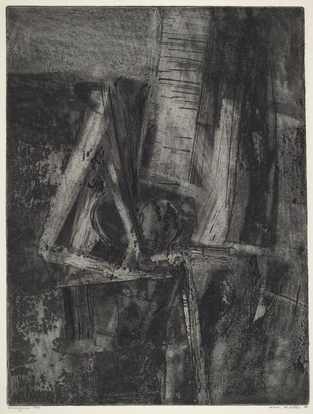 Curator: This print immediately gives me the feeling of ancient pictographs emerging from a cave wall, flickering in the firelight. Editor: I see what you mean about that primeval feel. We're looking at "Night Pattern" by Mary A. Chenoweth, created sometime in the 1950s. It's a compelling example of abstract expressionism rendered in graphite, showcasing the artist's adeptness with drawing and printmaking. Curator: The geometric forms against the dark background seem almost totemic, hinting at a ritualistic purpose. The symbols themselves… they’re almost recognizable, yet remain just beyond our grasp. Do you think it speaks to a collective unconscious, this echo of primal forms? Editor: I think the appeal of abstraction lies in its ambiguity, in the possibilities it offers for interpretation. Consider the time period: The 1950s was a time of tremendous anxiety surrounding nuclear proliferation and Cold War paranoia. Chenoweth was likely reacting to the socio-political landscape around her. Perhaps this obscurity is intentional, a reflection of the uncertain times? Curator: Certainly a viable position! But what’s particularly compelling is the dynamic between light and shadow. The contrast here heightens the mystery of these shadowy figures; like forms glimpsed in the twilight, inviting us to construct our own meaning from their enigmatic presence. Editor: That interplay of dark and light also underscores the influence of Surrealism and automatism on American art. Chenoweth isn’t interested in portraying observable reality so much as in making visible subconscious feeling, a perspective that art offered to her viewing public. Curator: True! The piece invites one to lean in and attempt to unravel a hidden code. Are they dwellings, symbolic figures, or just pure, emotive abstraction? Editor: Ultimately, it becomes a mirror. I think Chenoweth’s "Night Pattern," serves to reflect our own anxieties, projections, and search for meaning in a turbulent world. Its power resides in the void we, the viewers, are invited to fill. Curator: Well, in that case, I see stars. The artwork's appeal to the subconscious, mixed with cultural memory, provides an avenue to explore those feelings through symbols. Thank you for the context! Editor: And I think the piece pushes the viewer toward abstraction’s larger role. How does art respond to social disquietude, what forms does that reflection take? Hopefully the dialogue has furthered listeners' experience today!