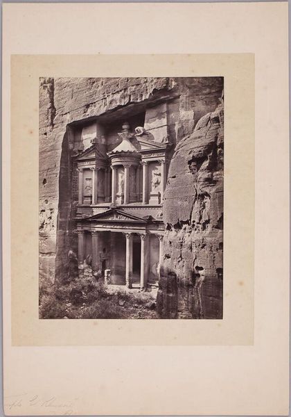 Curator: I am immediately drawn to the texture! This old photograph feels so rich with details; it's tactile despite being a two-dimensional image. Editor: Agreed. The way the light catches the facade, giving the timber framing this near palpable presence. Let’s contextualize. This is a print of a photograph, believed to have been taken between 1870 and 1890 by Mèdèric Mieusement. The Rijksmuseum holds it in their collection, aptly named "Exterior of a house in Rennes.” Curator: I love Rennes. Is it the building near the cathedral, or am I just making that up? Anyway, there's this cozy, almost hobbit-like feel, despite the obviously monumental architecture nearby. Editor: You are spot on. The photo is labeled “Maison pres la Cathédrale”. It makes you consider the labor involved in such detailed woodwork, doesn't it? How many hands shaped these beams, fitted the glass? It really emphasizes the value once placed in construction, where craftsmanship took pride of place. Curator: Exactly. It brings to mind those medieval guilds, passing down their knowledge of techniques to each other in Rennes, a very historical city. A photo, you know, flattens things. What feels grand in real life becomes compressed. How did the photographer mediate those inherent distortions to convey the reality and its sense of weight, I mean…what would the inhabitants make of their representation as an image? Editor: Mieusement would likely have chosen his angle and lens with deliberation to address the spatial depth and texture, but I see what you mean. The technology inevitably alters it but it can be used to elevate humble construction. Curator: Absolutely, it’s that sense of transformation and alchemy that really gets to me, the power the camera held and still holds! The house standing unchanged against time. Editor: Mieusement’s documentation reminds us to appreciate not just the aesthetic, but also the lives intertwined with this structure and its time. A humble frame opens endless horizons.