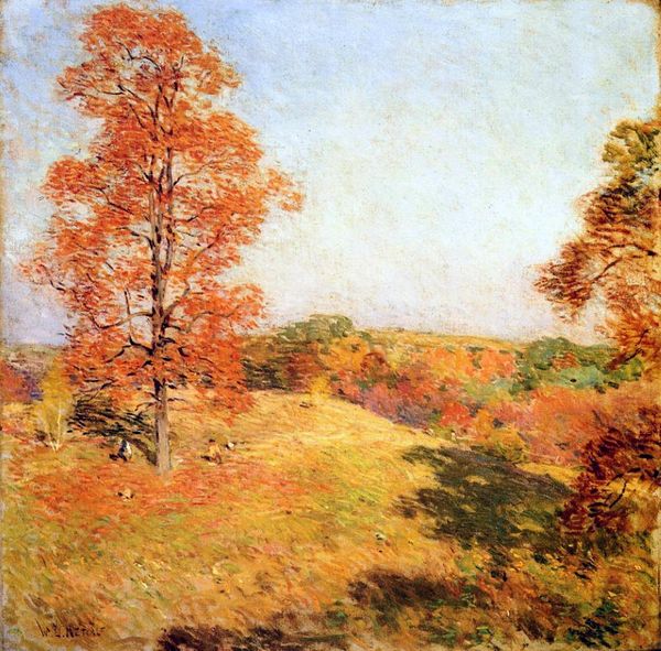 Editor: Here we have Renoir’s “The Pear Tree,” created in 1889 using oil paint. The dabs of color create such a vibrant image! What compositional elements stand out to you in this piece? Curator: Immediately, I am drawn to the textural complexity achieved through Renoir's distinctive brushwork. Consider how the short, broken strokes of paint articulate the leaves and foliage, creating a vibrant surface. How does this application of paint contribute to the overall sense of light and atmosphere? Editor: It feels like the leaves are actually shimmering! The light seems to bounce all around the canvas because of that technique. It almost looks more abstract than realistic. Curator: Precisely! Renoir moves beyond a mimetic representation to explore the optical effects of light. Notice the subtle variations in hue and value within the seemingly monochromatic foliage. This technique creates depth and volume and speaks to the impressionist interest in the subjective experience of vision. Do you observe how the structure functions beyond simple representation? Editor: Well, now that you point it out, the white tree trunks provide strong vertical lines that offer a visual contrast against the softness of the foliage. Also, the dark branches help to balance the brighter colors of the leaves. Curator: Indeed. It is through the formal arrangement of line, color, and texture that the image achieves its particular aesthetic quality. Editor: I hadn't thought about it that way, but looking at the structure and brushstrokes really changes how I appreciate the work. I can now see more than just the tree! Curator: Indeed. Focusing on such formal elements allow us to explore the very essence of the art.