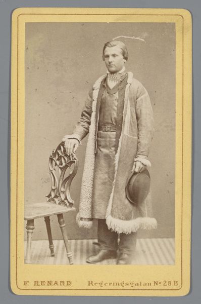 This is a photograph by Louis Robert Werner, featuring an unknown young man with a walking stick. Observe how Werner uses the formal elements of portraiture to construct not just an image, but an idea of the sitter. The sepia tone suffuses the image, lending a classical, almost timeless quality. The young man is elegantly posed. His stance, leaning casually against an ornate chair, holding a thin walking stick, speaks to a certain class and cultivated leisure. Note the composition; the careful arrangement of the body, chair, and stick create a series of diagonals, adding a sense of dynamic tension to the otherwise still image. There is a tension here between the formal conventions of portraiture and the subtle indicators of modernity. The photograph as a medium challenges the traditional notions of portraiture, making it more accessible. This tension encapsulates the shift in the cultural landscape of the time, where traditional class structures were slowly being destabilized by modernity. The photograph's aesthetic isn’t just about capturing an image, but also about participating in broader social and cultural dialogues.