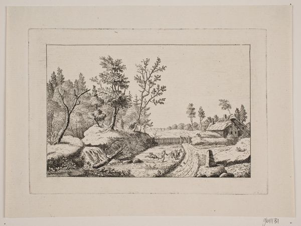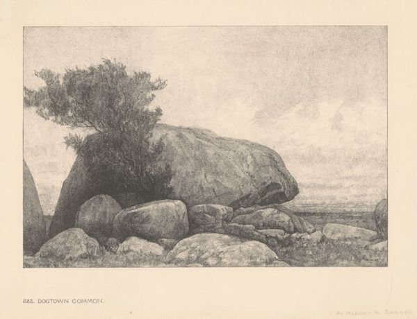 Curator: Look at this compelling engraving. Entitled "Udsigt over en fjordby. I forgrunden en stor sten" or "View over a Fjord Town. In the Foreground a Large Stone," created sometime between 1848 and 1926, from Waldemar Böhme, capturing a scene both monumental and serene. Editor: Monumental is right. The sheer scale of that rock in the foreground—it dwarfs everything, including those little figures next to it. It gives me this strange sense of...insignificance, yet also connection. Curator: It's interesting that you note the size. That imposition of the boulder is absolutely crucial, right? Because realism as an aesthetic here isn’t about objective representation, it’s about evoking that kind of feeling – wonder, even national pride. I wonder if, in a sense, these landscapes were almost nation-building projects for their audiences. Editor: Nation-building how? Is that imposing a social agenda onto a landscape? Is that the implication? What happens if, in a nation like Denmark that experienced wars and political and military humiliation in this period, someone seeing this wouldn't just feel inspired, but experience that acute tension of belonging—the exclusion of 'otherness'.? Curator: I take your point. But that large rock, also, what of its symbolism? Perhaps that stone itself acts as a link with prehistory? It dominates this imagined idyll: It grounds the scene and narrative to the pre-political and, even to the pre-human world. It's a clever tactic, to show power outside of the constraints of governmental failings. Editor: Hmmm. What I still love most about this, regardless, is that tactile feeling the engraving creates, like I could reach out and feel the rough surface of the boulder or the bristly grass at its base. Even in monochrome, the print communicates depth. What is this, pure nostalgia and nothing else? Curator: Well, maybe, there's a certain idealized vision here that conveniently overlooks socio-political realities. We must admit to that simplification but it also becomes this sort of imagined cultural ownership of the land itself. Thanks for pointing out the various lenses we need to bring here, today. Editor: It does gives one a lot to think about! It’s nice that a simple-seeming image is able to generate this kind of dialog today, and for the viewers beyond us too.