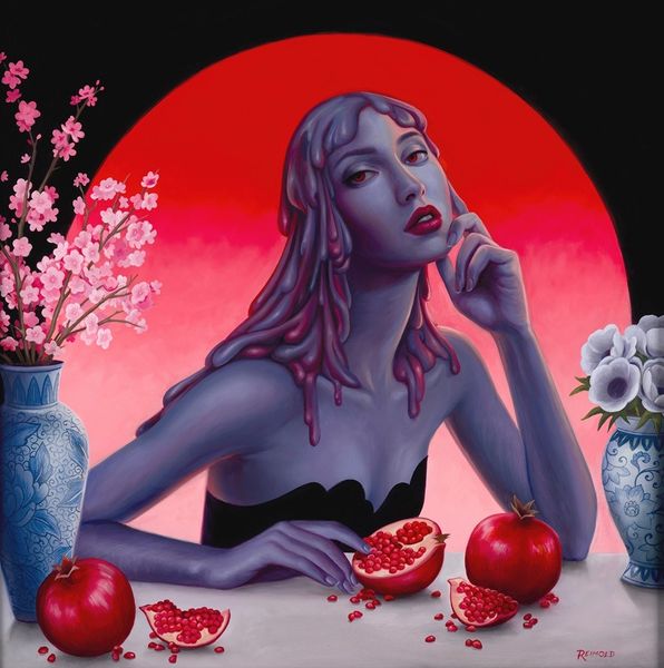 Editor: Here we have Sarah Joncas' oil painting, "Earthly Delights." It's quite striking – the nude figure immediately draws the eye, especially contrasted against the lush backdrop of roses. What elements of the painting do you find most compelling? Curator: From a formal perspective, the painting orchestrates a fascinating interplay between the organic and the constructed. Consider the careful positioning of the figure, lying amidst the foliage and adjacent to the cleaved pomegranate. The artist utilizes a restricted palette, mainly emphasizing shades of red, green, and flesh tones. How might you interpret the visual hierarchy Joncas establishes here? Editor: I notice how the bright red of the pomegranate and roses pops against the muted greens and skin tones. Is that use of color symbolic? Curator: One could delve into symbolic interpretations, of course. However, I am inclined to focus on how color contributes to the overall compositional structure. Observe how the artist exploits tonal variation to define form and space. Note how she utilizes modeling and shading, paying attention to transitions from light to dark, in order to give an illusion. The roses, being of deeper saturation and hue, exist to pull focus in the canvas, drawing our attention throughout the entirety of the picture. Editor: So you're focusing on how the artist uses the elements of painting themselves, like color and composition, to create meaning, rather than looking for external symbolism? Curator: Precisely. The artist’s careful rendering and strategic placement of elements allows for a profound aesthetic experience without recourse to overtly symbolic readings. In doing so, we find an understanding of its artistic merits without relying solely on interpretation. Editor: That's fascinating, I never thought to look at art that way. Thanks for sharing your insights. Curator: It's important to look beyond our initial conceptions. Reflective observations of paintings and visual engagement offer alternative, insightful appreciation.