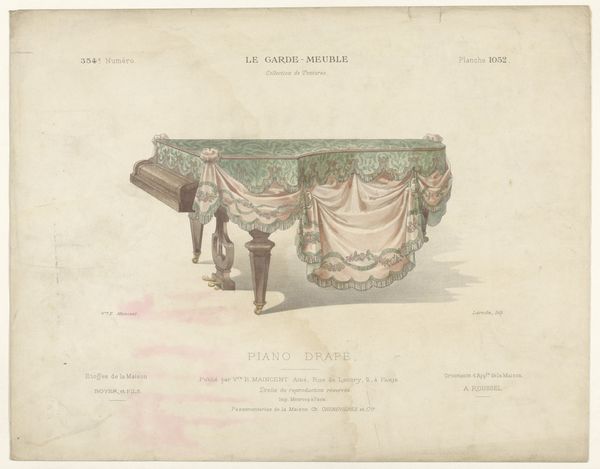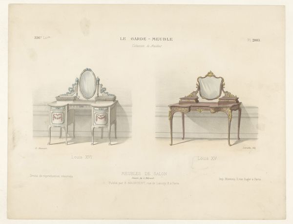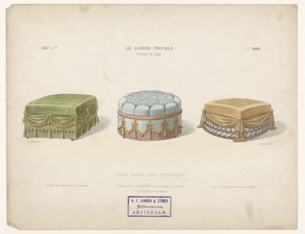 Curator: Welcome! Here we have "Drie poefen," which translates to "Three Poufs." It's an early decorative drawing, made sometime between 1895 and 1935 by Léon Laroche, using watercolor. It's got strong Art Nouveau and decorative art elements. Editor: My initial impression is that it feels very gentle and nostalgic. The colors are muted, and there’s something inherently domestic about the image. Almost like looking at sketches for a dollhouse. Curator: Definitely, there is that sense of intimacy, something very much in keeping with what was going on at the time. The choice of watercolor speaks volumes. These are images intended for interiors, suggesting comfort and a delicate beauty. Editor: I find it interesting how these decorative objects are framed, though. At a time when the burgeoning middle class was accruing so many domestic goods, do you see this drawing as advocating for increased accessibility or maintaining a certain level of luxury, given that it depicts these rather fussy designs? Curator: That's a good point, and perhaps it's both. On the one hand, these are essentially designs for things meant to beautify domestic space, catering to those with the means to pursue such comforts. However, the very act of documenting and illustrating these pieces suggests a desire to disseminate them, making them accessible as patterns, inspirations, or attainable goals for a wider audience. Consider the psychology of aspiration at play. Editor: Yes, that aspiration is visible. And seeing those very obviously hand-drawn design elements feels… handmade, in contrast to the coming era of mass manufacture. This moment feels suspended in time before those changes would become completely solidified. It preserves that desire for ornate individuality at a turning point. Curator: Precisely! It holds that cultural memory. And perhaps there’s a hidden comment on status. It speaks of refined sensibilities, almost an encoded language for belonging within certain circles. It says, "I appreciate beauty, craftsmanship, and have a cultivated eye". Editor: Yes! Even those little ribbons. Now that I notice the tassels! So many signals embedded in one little poof. Well, this definitely adds a few new layers to how I see my grandmother’s furniture now! Curator: It is amazing, isn't it, how an object—or even a drawing of an object—can contain so much history. Thank you for sharing these intriguing perspectives with me.