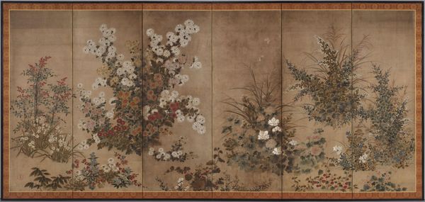 This is a six-panel screen painting, ‘Flowers and Grasses of the Four Seasons’, made by Kano Mitsunobu around the turn of the 17th century, with ink, color, and gold leaf on paper. It's impossible to miss the impact of that gold leaf ground. This wasn't just a decorative choice. Gold was a signifier of wealth and power, and it also creates a luminous surface, enhancing the painted details. Look closely and you'll see delicate brushwork used to depict the seasonal flora. Notice how the artist has captured the essence of each plant. The materiality speaks to a sophisticated artistic tradition, one where the inherent qualities of ink, color, and precious metals are celebrated. The production of such a screen would have been a labor-intensive process, involving skilled artisans in the preparation of the paper, application of the gold leaf, and, of course, the painting itself. Far from a simple division between art and craft, the screen represents a confluence of both. It stands as a testament to the rich material culture of the Kano school of painting and the social context in which it was created.