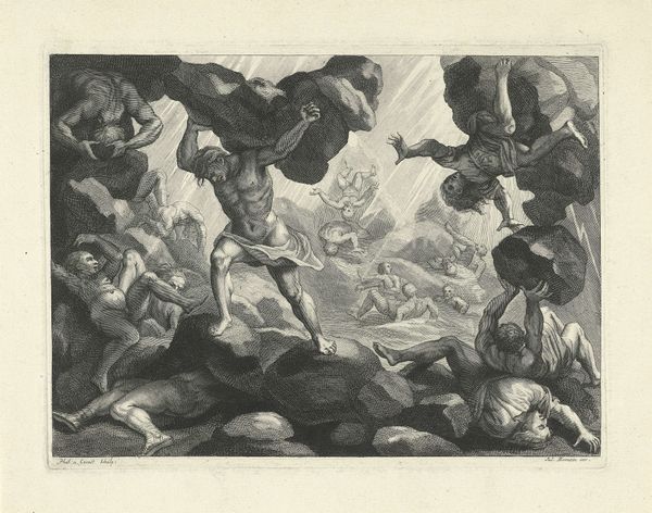 Jonas Suyderhoef created this print, titled "Leeuwenjacht," likely in the mid-17th century. Notice how the composition explodes with dynamic energy; a chaotic scene, crowded with figures and animals locked in combat. Suyderhoef masterfully uses line and texture to create a sense of depth and movement. The lines are fine and intricate, especially in the rendering of hair and fur. These elements create a rich, almost tactile experience that draws the viewer into the heart of the hunt. The arrangement of the figures isn't random; it's a carefully constructed hierarchy. Horse riders dominate the upper portion, their weapons and bodies angled in ways that suggest power and control. The semiotic interplay here suggests not just a hunt, but a struggle for dominance. The image is dynamic and the narrative is more than meets the eye. The details of line and form create a sense of drama, raising questions about power, nature, and human relationships.