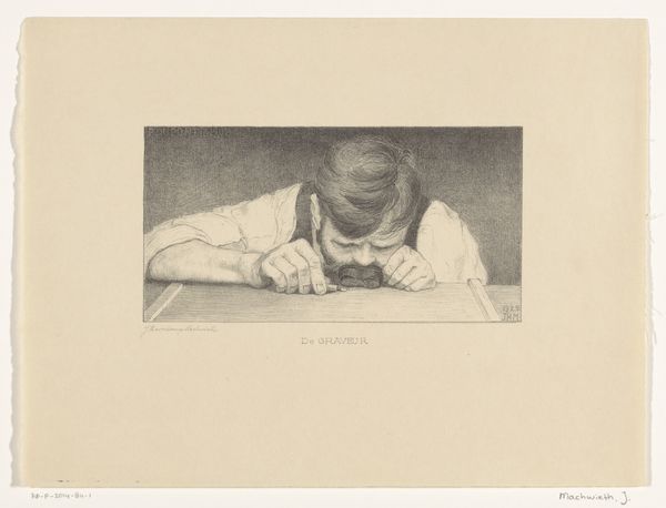 Editor: This is "Lezende vrouw, en profil," or "Reading Woman, in Profile," dating between 1880 and 1936. It’s an etching on paper, currently housed in the Rijksmuseum. I'm struck by how intimate it feels, like catching a glimpse of someone in a private moment of contemplation. The woman seems so absorbed, but also a little burdened. What's your take? Curator: It does have that air of quiet introspection, doesn't it? The artist really captures that weightiness of thought. I find myself wondering what she’s reading. The fact that we don’t know invites us to project our own stories onto her. Have you noticed the framing? It's not just the obvious frame of the picture, but the implied frame created by the arch of the bookshelf behind her. Editor: No, I hadn’t consciously noticed it before, but now that you point it out, I see how the arch seems to enclose her in her own world. Curator: Exactly! And that arch, coupled with the rather compressed space, almost gives her a theatrical, stage-like quality, as if we're peeking in on a performance of intellectual labor. It makes me consider how women were often portrayed in domestic settings during this period – sometimes romanticized, other times, as perhaps here, recognized for their inner lives, but still firmly placed within the confines of their environment. What do you think that says? Editor: It’s interesting to consider the tensions there – the simultaneous acknowledgment and constraint. It makes you wonder what other stories are hidden behind those shelves. Curator: Indeed. Perhaps the etching itself is just a portal into an unwritten novel. So glad we took this short journey together!