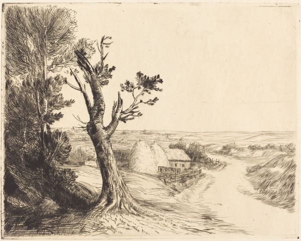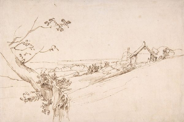 Curator: This pencil drawing, created around 1820 by Johann Christoph Erhard, offers us a view of the Roman Campagna with the Tiber near Torre Quinto. Editor: My immediate impression is of a kind of wistful emptiness, a stark landscape rendered with a surprising delicacy of line. Curator: Indeed, the use of line is key here. Erhard employs it to capture not just the contours of the land, but also a sense of its historical weight and the effects of time. Remember, this is during a period of immense social upheaval and romanticizing of the past. How might this idealized landscape interact with, say, contemporary notions of displacement? Editor: That’s interesting. I am also intrigued by how the composition is structured, drawing the eye from the imposing rock formation and solitary tree on the left, across the wide expanse of the Tiber, towards that distant tower. It creates a clear visual hierarchy, foreground to background. Curator: Precisely. And in that foreground, the stark presence of nature feels deliberately positioned against that distant, fading structure of civilization. This speaks to a larger cultural fascination of the time—the sublime and the impact of progress. It invites us to consider the relationship between human constructions and the natural world as understood in the post-Napoleonic era, doesn’t it? Editor: Agreed. The drawing is really about contrasts: the rough texture of the rocks versus the smooth river surface, the closeness of the foreground compared to the far-off vista. It uses those tensions to guide our understanding of the landscape itself. Curator: I appreciate how the artwork enables a conversation about not only romantic landscape traditions but broader narratives of land ownership and nationhood during the artist's time. It helps us locate individual experience within a historical and political landscape. Editor: And I find the beauty in its bare essence compelling, showing how much expressive potential resides within what at first might appear to be a simple sketch. It’s elegant.