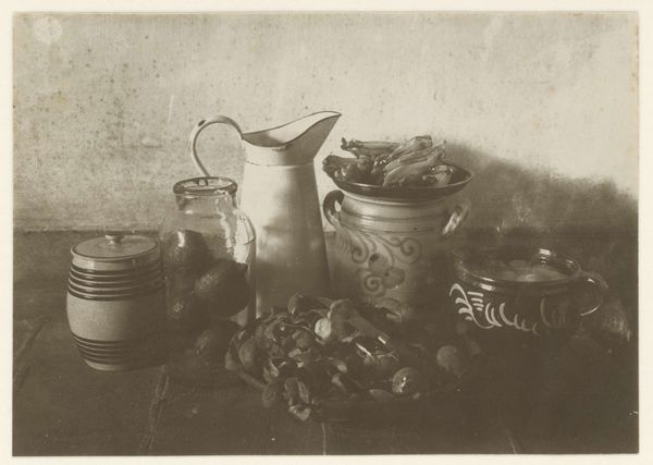 Editor: Hippolyte Bayard’s “Composition au chapeau,” from around 1842-1865, showcases the potential of early photography. It is currently housed at the Art Institute of Chicago. I am drawn to its intimate still life – it has a quality of a tableau or set. What does it suggest to you? Curator: I see it as Bayard staking his claim, carving out a space for photography within the established art world of 19th-century France. Photography was in its infancy, struggling for acceptance as a legitimate art form. Bayard's staging feels almost defiant, a deliberate artistic construction against the perceived objectivity of the camera. Notice how he arranged ordinary objects -- watering cans, a straw hat, pots -- almost like props. What kind of performance, or scene, did Bayard create here, do you think? Editor: It definitely feels constructed, rather than found, more deliberate than accidental. Perhaps a casual domestic scene but with a hint of artificiality? Curator: Precisely. It’s essential to remember the socio-political context. Bayard, frustrated by what he perceived as a lack of recognition from the French Academy of Sciences regarding his photographic process, even created a “self-portrait” of himself as a drowned man. This photograph could be seen as a subtler act of rebellion, manipulating the supposedly impartial medium to convey his artistic vision. Do you see any signs of manipulation of what some would believe to be a tool that reveals "reality?" Editor: Looking at it that way, I can see a deliberate placement of items, even a quiet, understated critique through artistic control. I see how a work's reception, as well as the cultural politics, shaped the artist’s decision-making in these times. Curator: Absolutely. Understanding art necessitates looking beyond the image to the power dynamics at play. These forces greatly influenced both production and our subsequent understanding of the art of photography in its beginnings. Editor: Fascinating to see this work in a context where photography had to legitimize its place within fine arts!