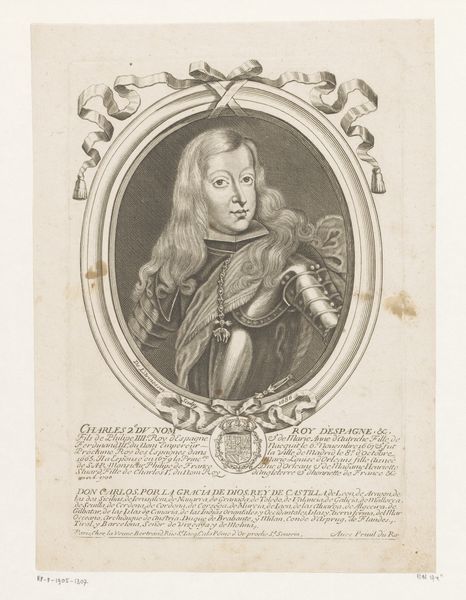Curator: This is an engraving from 1679, a portrait of Charles II, King of Spain, by Nicolas de Larmessin I. It's part of the Rijksmuseum's collection. Editor: My initial reaction? It's incredibly detailed. The textures of the armor and the King's hair are almost palpable, a remarkable display of the engraver’s skill. There's something rather melancholic about the subject, though. Curator: The somber mood aligns with the historical narrative surrounding Charles II. He's often remembered as the last Habsburg ruler of Spain, and his reign was marked by political instability and his own ill health, which had significant implications for the future of the Spanish monarchy. This image functions, in part, as a reflection of dynastic anxiety. Editor: Look at the frame – that delicate ribbon seems almost too fragile to contain the rigid portrait underneath. The balance, the tension created through form— it is absolutely compelling! How does the broader symbolic language function within that period? Curator: Consider the role of portraiture in legitimizing power. Larmessin’s decision to depict Charles II in full armor adheres to established visual strategies of associating monarchy with strength. Yet, we can read something more subtle. Even in the armor, there's a vulnerability that resonates with the anxieties surrounding his reign, that very dynastic insecurity you notice here at the very structural level. Editor: Yes, I find it difficult to reconcile the imposing presence the attire tries to communicate with his expression. There is a detachment. How much was Larmessin attempting to immortalize the subject and how much were socio-historical elements like patronage driving the work? Curator: It’s both. Court artists served their patrons. They captured the likeness of rulers and perpetuated the visual rhetoric of power. Simultaneously, an artist’s choices and subtle cues allow for alternative interpretations that resonate in time, so something of both can co-exist and create a really complicated work. Editor: I am left reflecting on how formal artistic choices can simultaneously conform to, and subvert, the expectations of a society in periods of instability. Curator: And I find myself wondering about the very human dynamics present, and the burdens placed on those historical figures caught within a structure far bigger than them.