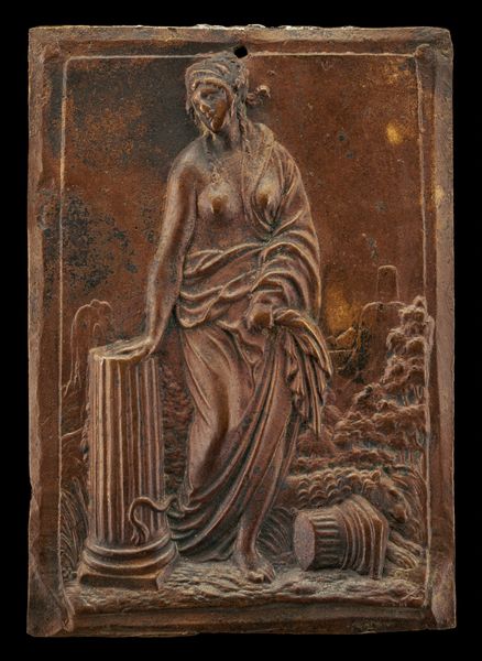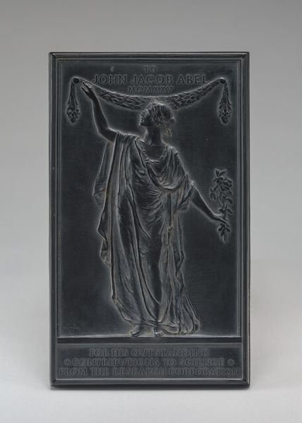 Editor: This marble relief, created by Josef Tautenhayn in 1904, is titled "To Commemorate the Centennial of the Austrian Empire." The monochrome palette lends a somber tone. The figure appears timeless, almost stoic. What symbols are at play here? Curator: The figure you describe is a personification of Austria, a figure embodying the nation. Consider the laurel wreath crowning her brow, a classical symbol of victory and honor, echoed in the sprigs beneath the tablet. The tablet she holds bears the dates of the Austrian Empire. Note also her regal stance, holding a stylus – an allusion to artistic and intellectual prowess. Doesn't that invoke ideas of eternal values that outlive the fleeting politics of its rulers? Editor: I see what you mean. So the artist is using classic imagery to promote a message about the Empire's enduring legacy, even though the title points to it as something newly formed. But how would a viewer at the time understand this piece? Curator: Remember the political context. The Austro-Hungarian Empire, by 1904, was facing internal tensions and nationalist movements. This work speaks to anxieties surrounding identity, longevity, and cultural memory. Does she seem timeless, or burdened by the weight of time? This tension becomes embedded in her image, as well as in our reception of the image today, as the Empire no longer exists. The visual language speaks both to aspirations and to realities of political fragmentation. It calls to question, what persists? Editor: It's fascinating to see how an object like this can embody not only a nation's ideals, but also its underlying concerns, using symbols as its most enduring language. Thank you! Curator: Indeed, a potent reminder of the power of art to transcend specific moments, embedding continuity and aspiration through time.