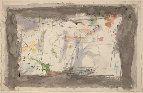 Editor: This is Paul Klee’s "Laternen," created in 1912 using watercolor and what looks like coloured pencil. I am intrigued by the interplay of the dark washes and the thin, linear elements... It almost feels like a blueprint. What strikes you when you look at this, from your perspective? Curator: What fascinates me is Klee's process. Look at how he marries what were then considered 'high art' and 'low art' materials, watercolor traditionally associated with landscapes, and the coloured pencil we may have found in the drafting room. Do you notice how the watercolour bleeds into the fibers of the paper itself? Editor: Yes, the textures definitely add another layer! Curator: Precisely! Consider too, that this piece was created in 1912 - amidst massive industrial development and shifting class dynamics in Europe. Could the "blueprint" quality you noticed perhaps be a commentary on these changes? Is Klee speaking to anxieties and hopes bound up with materiality and industrial manufacture of that era? Editor: I never thought of it that way. It's interesting how the materials themselves might reflect larger social and economic changes. So, it's not just about the "what" is depicted, but *how* it's depicted and *what with* that reveals the underlying message. Curator: Exactly! The artistic process and choice of material provide an entry point into thinking about Klee's own positioning in relation to this changing world. It asks us to examine his labor in the work. And how does our own consumption, or viewing, complete that cycle? Editor: I see! Thanks, this gave me so much to consider.