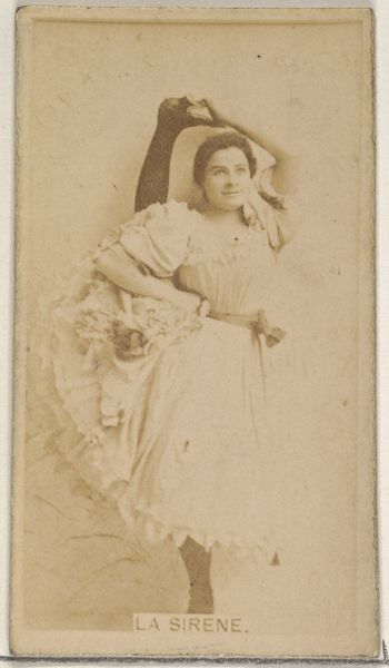 This small card, printed by the Kinney Brothers Tobacco Company, is one of many from their Actresses series, designed to promote Sweet Caporal Cigarettes. It is made of paper, a mass-produced material, but the image on it has a longer, more involved history. The photograph was likely captured with a large format camera. The wet plate collodion process was used to create a highly detailed negative from which multiple prints could be made, a technique that enabled mass production. The image is sepia-toned, a chemical process that improves archival stability, but also gives the card an antique feel that was popular at the time. What's interesting is how the mass production of these cards and the seemingly high-art subject matter of La Sirene intersect. The image flattens the actress into a commodity, a collectible to be consumed along with the cigarettes. It is a reminder that even seemingly high-end cultural products are deeply embedded in the everyday world of labor, commerce, and consumption.