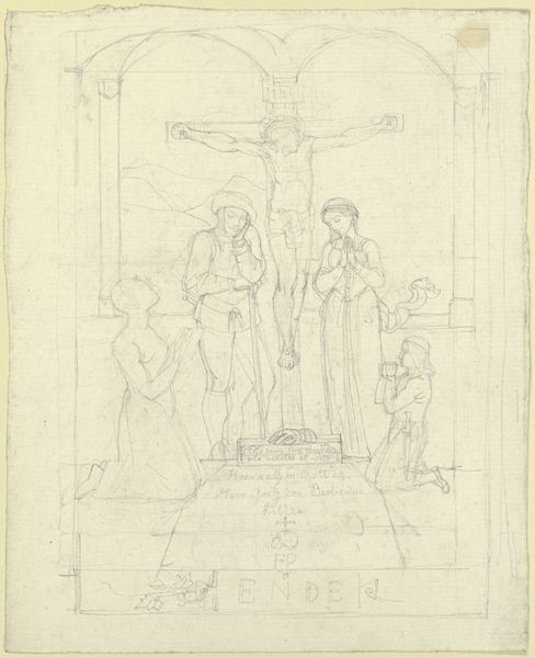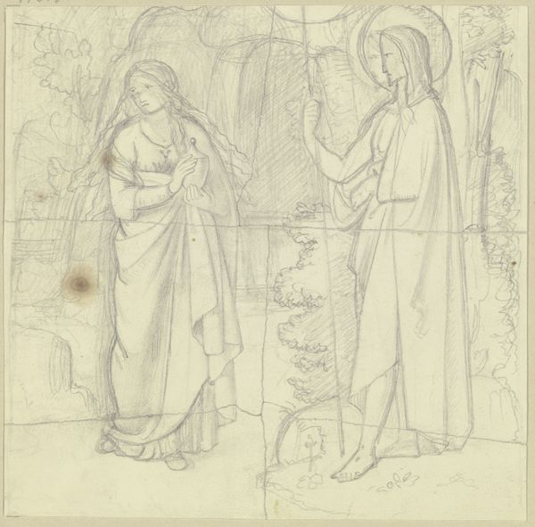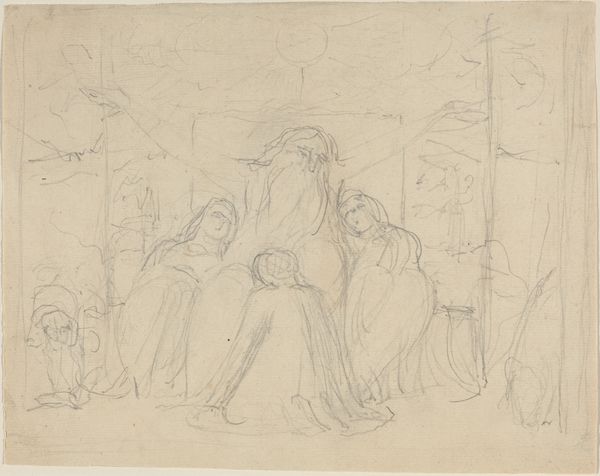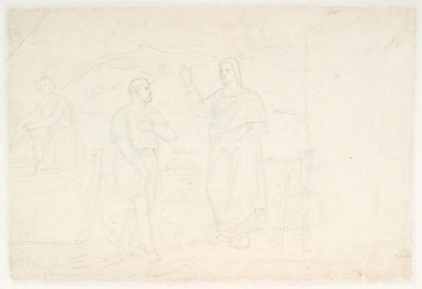 Editor: Here we have Victor Müller's pencil drawing, "Schreitendes Paar am Ufer, rechts ein Kahn mit Schiffer," which translates to "Walking Couple on the Shore, a Boat with a Skipper to the Right." The quick, almost skeletal lines create an intriguing sense of motion and fleeting emotion, like a half-remembered dream. How do you read this composition? Curator: It's fascinating how Müller evokes the Romantic spirit through such minimal means. Given the prominence of such imagery in the early 19th century, one wonders what Müller *intended* this drawing to signify, and what role these tropes played in shaping viewers' understanding of the human condition at the time. Why choose these themes – of wanderers and isolated boats – for artistic exploration and public consumption? Editor: That makes me consider the intended audience and purpose... It’s less a completed artwork, more like a preliminary sketch, so perhaps the social context of the piece matters less. It could just be Müller working out his ideas. Curator: But even sketches are revealing! The choices are still present: where he chooses to place the figures, how he relates them to the landscape. Think of the Romantics’ interest in the sublime, the power of nature, the individual's place within that grand scheme. Do you think the rawness of the drawing challenges or reinforces those societal narratives? Editor: I think it reinforces the romantic notion, stripping it bare and honest. It shows nature's grandiosity versus humans. But also the human element is comforting... I’ve changed my perspective now to see it more as intentional. Curator: Exactly! We need to ask questions about not only the work's subject matter, but the mechanisms that shape its dissemination. By thinking critically, can expose subtle ideologies embedded in these depictions, right? Editor: Absolutely! It also shows how art evolves in stages, both revealing and obscuring layers of social meaning through artistic conventions. Curator: Well, the social lives of images evolve. As scholars, that’s something that we also share.