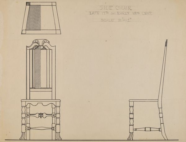 Editor: This is a drawing titled "Side Chair" from 1936 by Harry Eisman. It looks like a technical drawing or architectural rendering. What immediately strikes me is the contrast between the very precise geometric lines and the ornate, almost Baroque details of the chair design. What do you see in this piece? Curator: What I observe is a deliberate interplay of form and function rendered through line. Consider the semiotics of the line itself: hard, factual notations of measurement contrasting with the elegant curves defining the chair's back and legs. This visual dichotomy generates tension. Does it suggest a conflict between industrial pragmatism and artistic expression, typical for that time? Editor: That's an interesting way to look at it! I was just seeing them as different design elements, but framing it as a tension is insightful. Do you think the artist was making a statement about design philosophies? Curator: Possibly. One might explore the structuralist underpinnings here: the binary opposition of straight and curved, functional and ornamental. This creates a system of visual communication. How might that reflect broader societal shifts in attitudes toward design during the 1930s? Is the line itself the most prominent feature of architectural work? Editor: I hadn't thought about it in terms of binary oppositions. Now that you mention it, the grid pattern on the chair back also emphasizes that structural element. I see how the drawing isn't just a representation, but an exploration of design concepts through visual language. Curator: Precisely. By deconstructing the visual elements, we begin to uncover a deeper understanding of the work’s meaning. Editor: This makes me think of functionalism and art deco. The interplay between practicality and embellishment opens up new insights on that era of design. Curator: Indeed. I hadn't considered that perspective.