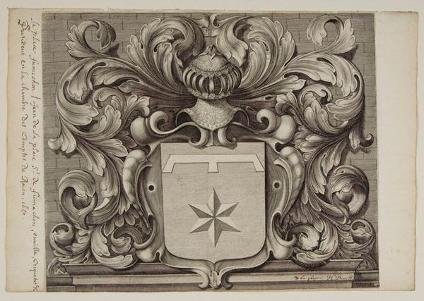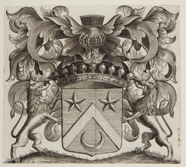Editor: This is an anonymous etching called "Coat-of-Arms of Lanteuil," housed at Harvard. The details are incredible, and the unicorns give it a somewhat magical quality. What's your take on this heraldic design? Curator: Ah, heraldry! It’s a fascinating blend of history, symbolism, and art. Notice the unicorns; they represent purity and grace, but also power. They are supporting a shield with an intricate pattern. It makes me wonder, what stories did the Lanteuil family want to tell the world? What kind of power are they trying to project? Editor: So, beyond the show of power, is there a deeper meaning to the design choices? Curator: Absolutely! Every element was carefully chosen. The helmet above the shield suggests nobility, and the elaborate foliage adds to the overall sense of grandeur. Perhaps even a touch of fantasy. It really is more than just a family logo, isn’t it? Editor: Definitely food for thought. I hadn't considered the fantasy aspect before.